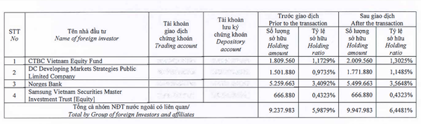 Cụ thể, CTBC Vietnam Equity Fund đã mua 200.000 cổ phiếu HDG, DC Developing Markets Strategies Public Limited Company và Norges Bank mua vào lần lượt 270.000 cp và 240.000 cp. Hiện tỷ lệ sở hữu của ba quỹ lần lượt là 1,3%, 1,15% và 3,56%.