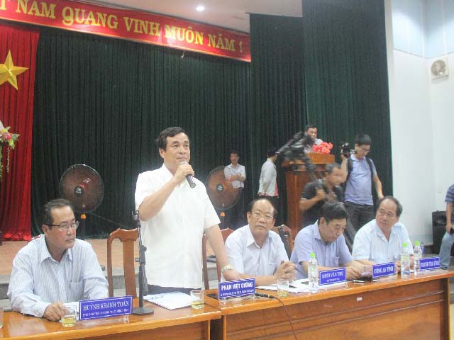 Ông Phan Việt Cường (đứng), Bí thư Tỉnh ủy Quảng Nam, phát biểu tại buổi đối thoại với người mua đất của Cty Bách Đạt An và Cty Hoàng Nhất Nam. (Ảnh: Trương Hồng)