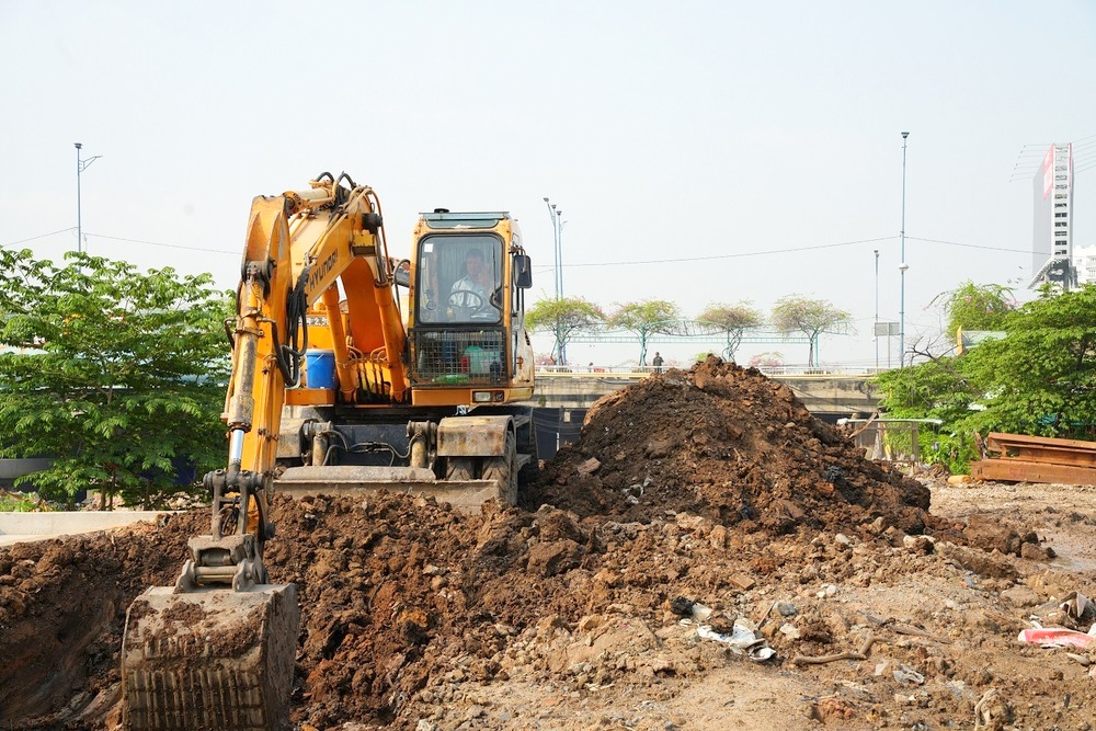 Các đoạn đang làm cho thấy dấu hiệu tăng tốc: máy xúc Hyundai đào đất dọc bờ, xe lu lăn đường, khối bê tông cống hộp xếp chồng chất – nhưng đống đất khổng lồ vẫn chất tại chỗ do thiếu chỗ đổ, thi công chưa đồng đều giữa các gói thầu (tiến độ gói dao động 53-80%).