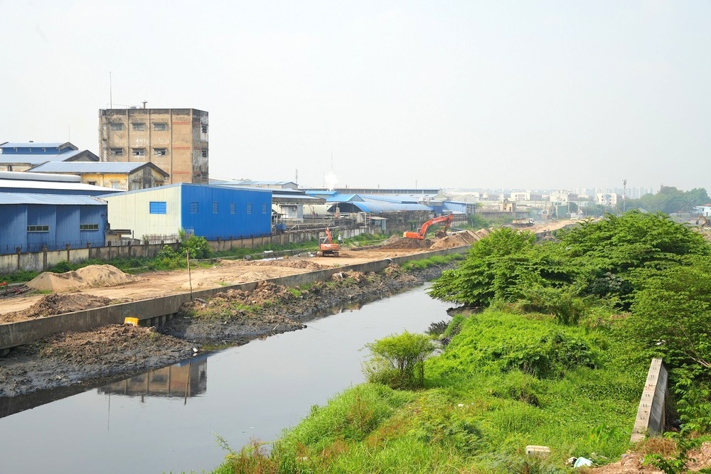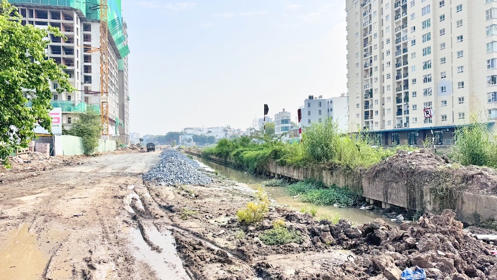 Những đoạn đã làm nhưng chưa hoàn thiện có kè bê tông hai bên hình thành rõ nét, nước kênh trong hơn, một số khu vực xen kẽ cây cảnh dân sinh và cao ốc mới; đường ven kênh đã cơ bản xong phần nền nhưng vẫn tạm bợ, đất rơi vãi, chưa thông suốt toàn tuyến.