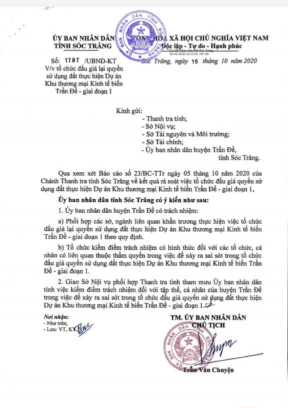 Cụ thể, Công văn số 1787/UBND-KT do Chủ tịch UBND tỉnh Sóc Trăng ký ban hành yêu cầu UBND huyện Trần Đề có trách nhiệm: phối hợp các sở, ngành thực hiện tổ chức đấu giá lại; Tổ chức kiểm điểm trách nhiệm có hình thức đối với các tổ chức, cá nhân có liên quan thuộc thẩm quyền trong việc để xảy ra sai sót trong tổ chức đấu giá quyền sử dụng đất thực hiện dự án. Đồng thời Chủ tịch UBND tỉnh Sóc Trăng giao cho Sở Nội vụ phối hợp Thanh tra tỉnh tham mưu cho UBND tỉnh việc kiểm điểm trách nhiệm đối với tập thể, cá nhân của huyện Trần Đề trong việc để xảy ra những sai sót tại dự án khu thương mại khinh tế biển Trần Đề giai đoạn 1.