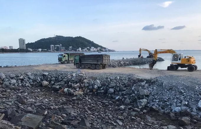 Trong diễn biến hiện tại sau khoảng 1 tháng khởi công, dự án san lấp đang tiếp tục được triển khai. Hàng ngày xe tải, máy xúc hoạt động liên tục tại đây. Người đi ra biển có thể nhìn thấy cảnh thi công tấp nập, hàng ngàn m3 đất đá đã đổ tràn lấp ra xa bờ, một bãi đất rộng lấn biển đã hiện hữu.