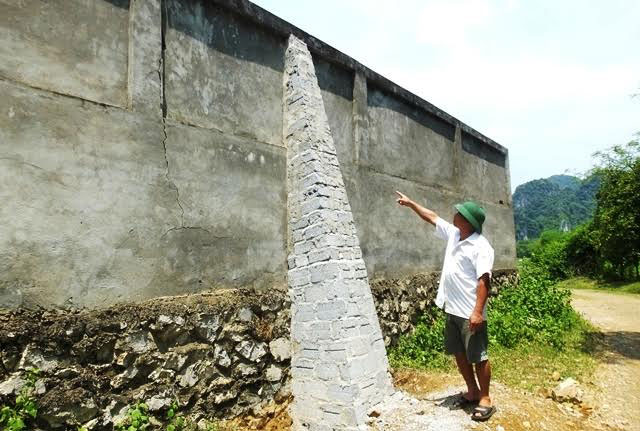 | Bờ tường bị nứt, đổ đang được gia cố. |