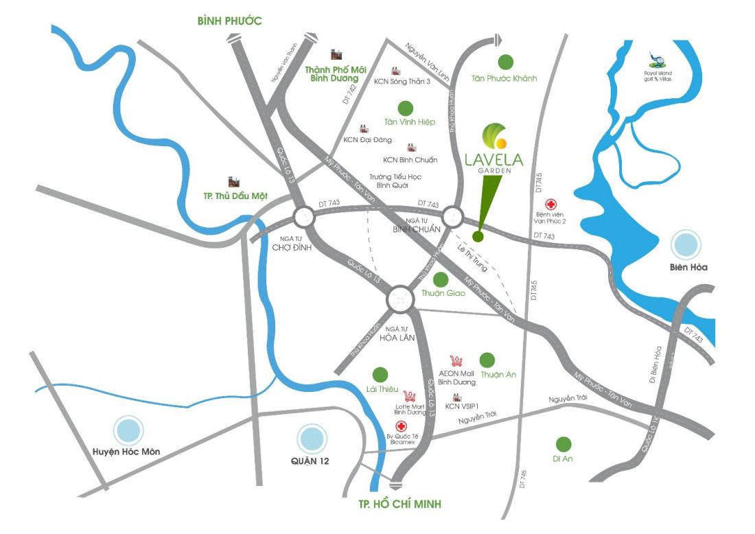 Điểm thuyết phục đầu tiên và quan trọng nhất của LaVela Garden chính là vị trí “độc tôngiữa các tuyến giao thông huyết mạch của các hoạt động công nghiệp, kết nối các khu vực liền kề: DT743 và Mỹ Phước – Tân Vạn.