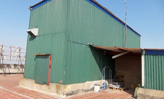Mô tơ thang máy Tòa nhà Sakura được quây bao thô sơ bằng tôn. ảnh: Phương Anh