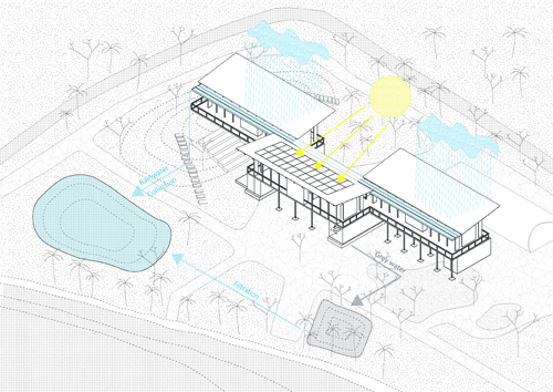 Công trình được định hướng dọc theo trục Đông - Tây để giảm thiểu hấp thụ nhiệt, tránh ánh nắng rọi trực tiếp nung nóng mặt đứng. Ngôi trường cũng được thiết kế hoàn toàn tách khỏi hệ thống lưới cung cấp điện, nhằm giảm thiểu tác động đến môi trường.