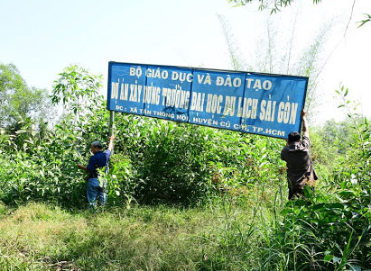 Sau 8 năm được chấp thuận địa điểm, Dự án Xây dựng Trường đại học Du lịch Sài Gòn trên thực địa hiện nay chỉ có mỗi tấm bảng ghi tên, dựng nghiêng ngả.