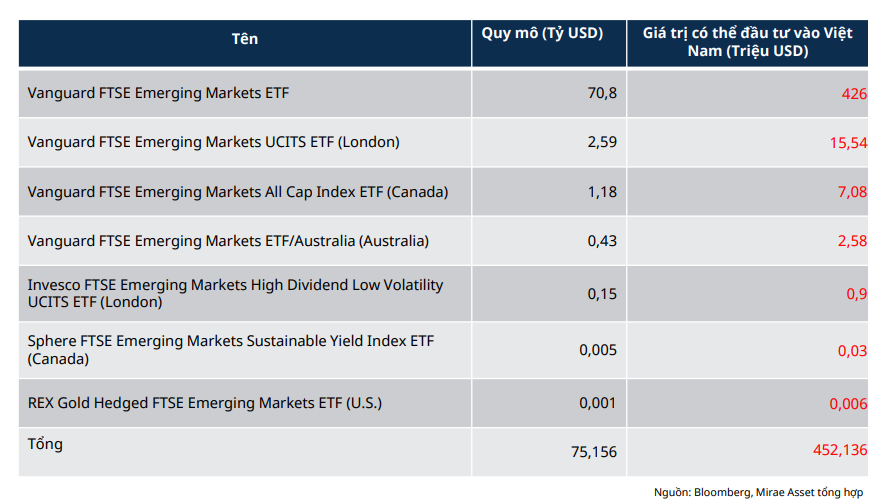 Tổng hợp một số quỹ ETF sử dụng FTSE Emerging markets Index làm tham chiếu, với tỷ trọng phân bổ 0,6%, Việt Nam có thể nhận đầu tư như bảng giả định bên dưới, ước tính khoảng 452 triệu USD (gần 11.000 tỷ đồng).