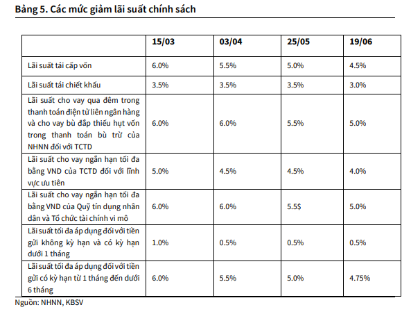 Các yếu tố hỗ trợ đà giảm lãi suất bao gồm: Các chính sách nới lỏng có độ trễ tiếp tục là động lực lớn nhất cho đà giảm của lãi suất. Do các khoản huy động của hệ thống ngân hàng phần lớn từ tiền gửi khách hàng (chiểm tỷ trọng khoảng 70%-80%) có kỳ hạn chủ yếu từ 6 -12 tháng khiến cho chi phí vốn nửa đầu năm của ngân hàng vẫn ở mức cao. Vì vậy, khi các khoản tiền gửi này đạo hạn sẽ làm giảm COF của hệ thống, qua đó tạo điều kiện để giảm lãi suất cho vay.