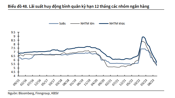 KBSV dự báo lãi suất huy động sẽ đi ngang từ nay đến cuối năm, với mức lãi suất huy động bình quân 12 tháng của các ngân hàng quanh mức 5,45% (giảm – 2,8% so với đầu năm). Lãi suất cho vay đã giảm nhanh hơn trong giai đoạn quý 3/2023 do các nguồn huy động chi phí cao đáo hạn, tuy nhiên tình trạng nợ xấu tăng nhẹ trong quý 3/2023, việc NHNN giảm tỷ lệ vốn ngắn hạn cho vay trung dài hạn từ 34% xuống 30%, và áp lực từ lạm phát và tỷ giá gây cản trở đà giảm có thể tiếp tục xa hơn.