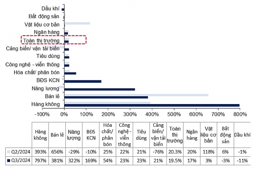 Các ngành được dự báo có thể tăng trưởng lợi nhuận nổi bật gồm bán lẻ, tăng 381% so với cùng kỳ; năng lượng tăng 321%; bất động sản khu công nghiệp tăng 169% từ nền thấp cùng kỳ.