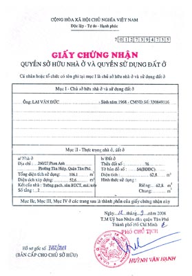 | Giấy chứng nhận quyền sở hữu nhà ở và quyền sử dụng đất giả mà Lai Văn Đức mang đi cầm cố để chiếm đoạt tài sản. |