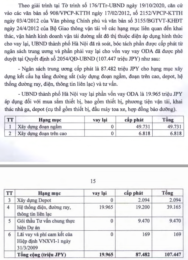 Sau đó, năm 2012, dự án này đã từng được UBND TP. Hà Nội đề xuất điều chỉnh tổng mức đầu tư là 51.750 tỷ đồng. Tuy nhiên, trên cơ sở ý kiến thẩm tra của tư vấn độc lập, vào tháng 7/2016, Bộ Kế hoạch và Đầu tư đã đề nghị UBND TP. Hà Nội điều chỉnh dự án với tổng mức đầu tư không quá 30.069 tỷ đồng.