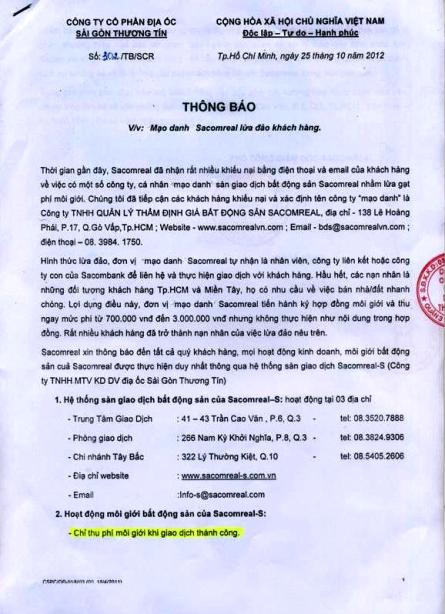 Theo tìm hiểu PV VTC News, thời gian gần đây, Công ty TNHH MTV kinh doanh – dịch vụ điạ ốc Sài Gòn Thương Tín, tên giao dịch Sacomreal đã nhận rất nhiều khiếu nại bằng điện thoại và email của khách hàng về việc có một số công ty, cá nhân mạo danh sàn giao dịch bất động sản Sacomreal nhằm lừa gạt phí môi giới.