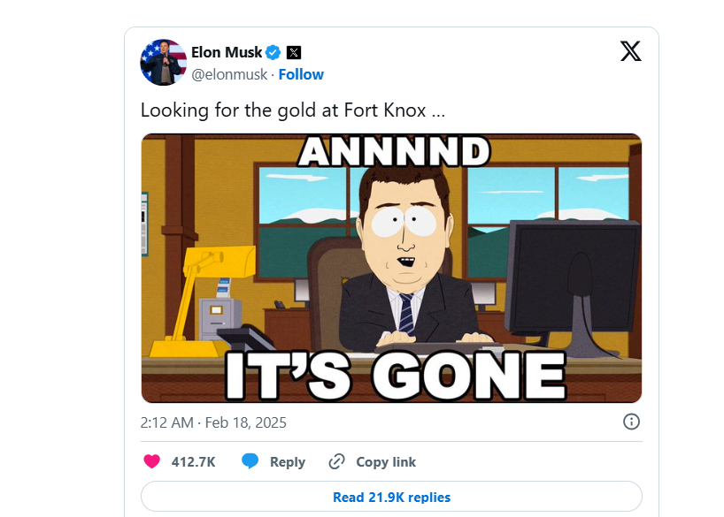 Tỷ phú này thậm chí đã đăng một bức ảnh chế từ loạt phim hoạt hình South Park với dòng chữ “Annnnd It’s Gone” (Và nó đã biến mất) để châm biếm việc kiểm tra kho vàng.