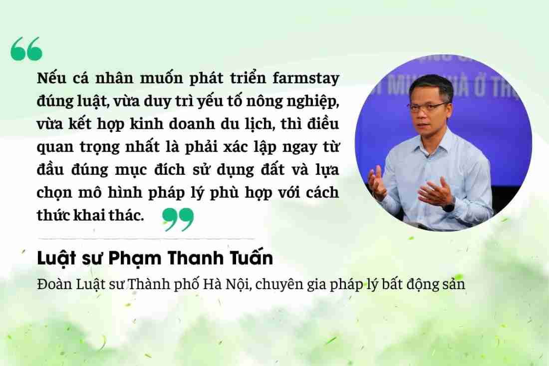 Theo tôi, nếu cá nhân muốn phát triển farmstay đúng luật, vừa duy trì yếu tố nông nghiệp, vừa kết hợp kinh doanh du lịch, thì điều quan trọng nhất là phải xác lập ngay từ đầu đúng mục đích sử dụng đất và lựa chọn mô hình pháp lý phù hợp với cách thức khai thác.