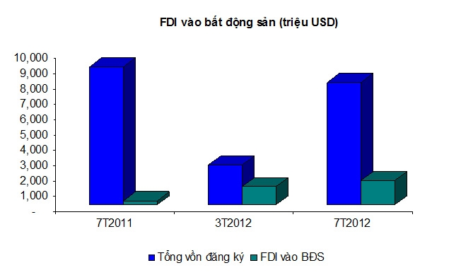 Tính đến ngày 20/7/2012, cả nước có 584 dự án có vốn đầu tư nước ngoài (FDI) mới được cấp giấy chứng nhận đầu tư với tổng vốn đăng ký 5,2 tỷ USD, bằng 55,9% so với cùng kỳ năm 2011. Tính chung cả cấp mới và tăng vốn, FDI vào Việt Nam đạt 8,03 tỷ USD, bằng 66,9% so với cùng kỳ 2011.