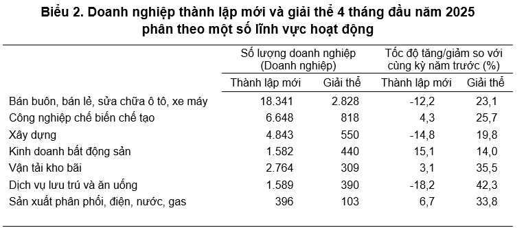 Theo khu vực kinh tế, trong bốn tháng đầu năm 2025 có 496 doanh nghiệp đăng ký thành lập mới thuộc khu vực nông, lâm nghiệp và thủy sản, giảm 0,8% so với cùng kỳ năm trước; gần 12,1 nghìn doanh nghiệp thuộc khu vực công nghiệp và xây dựng, giảm 4,4%; gần 39,1 nghìn doanh nghiệp thuộc khu vực dịch vụ, tăng 0,2%.