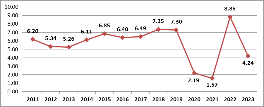 Tốc độ tăng GDP 9 tháng so với cùng kỳ năm trước các năm 2011-2023 (%). Nguồn: TCTK