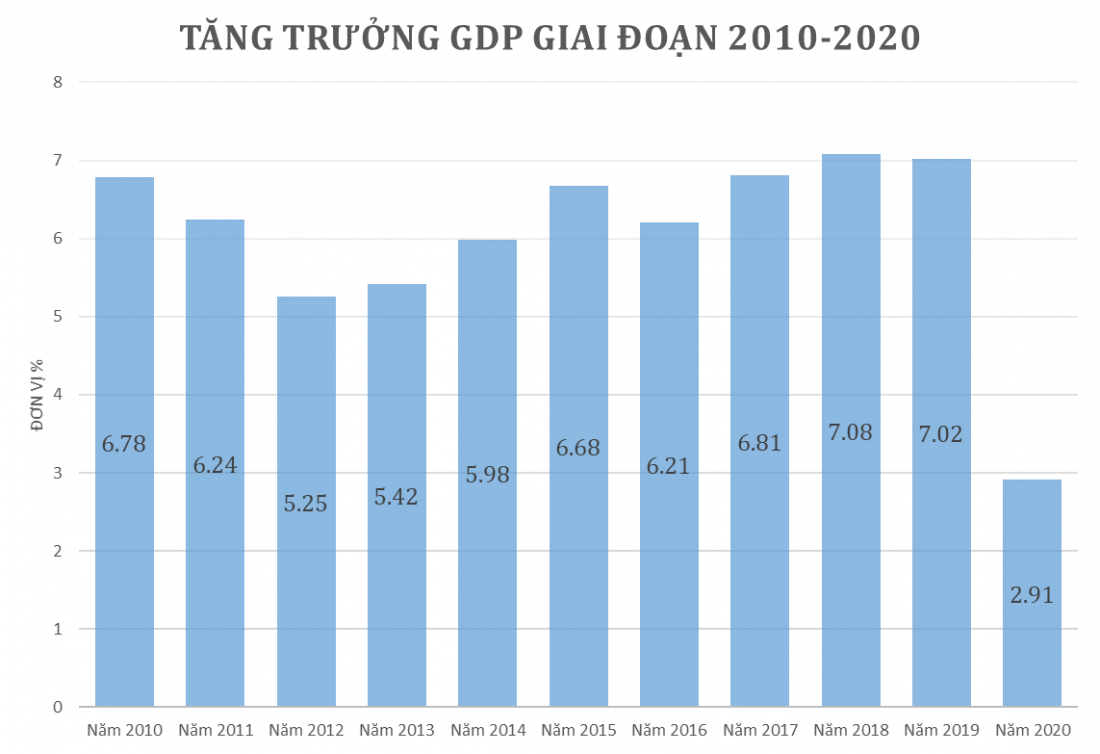 Cụ thể, tăng trưởng GDP quý 1 đạt 3,68%; quý 2 tăng 0,39%; quý 3 tăng 2,69%; quý 4 tăng 4,48%. Cơ quan thống kê đánh giá, tuy mức tăng trưởng GDP năm 2020 thấp nhất trong thập kỷ gần đây nhưng trong bối cảnh dịch Covid-19 diễn biến phức tạp, ảnh hưởng tiêu cực tới mọi lĩnh vực kinh tế – xã hội thì đây là thành công lớn của Việt Nam với mức tăng trưởng năm 2020 thuộc nhóm cao nhất thế giới.
