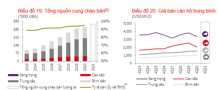 Tính đến hết năm 2020, tổng lượng mở bán chính thức chỉ ghi nhận gần 15.400 căn, chưa bằng một nửa so với năm 2019. Phân khúc bình dân và trung cấp tiếp tục dẫn đầu nguồn cung trong quý này với hơn 70% thị phần. Khoảng 28% còn lại đến từ phân khúc cao cấp, chủ yếu đến từ hai dự án mới là BRG Park Residence của Tập đoàn BRG và Masteri Water Front của Tập đoàn Masterise. Dự án này cũng đánh dấu sự gia nhập thị trường của thương hiệu Masterise Homes tại Hà Nội.