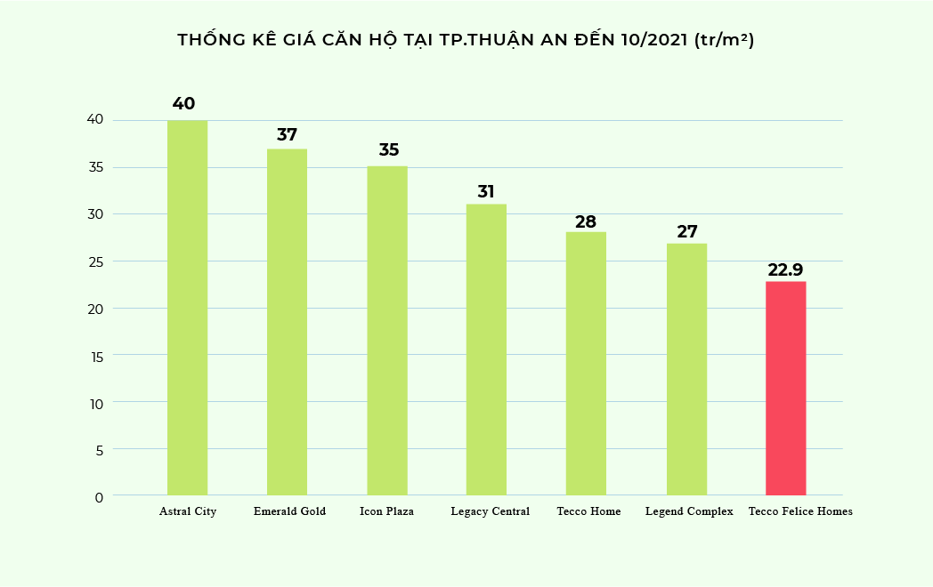 Theo đà phát triển các khu công nghiệp, tại TP.Thuận An nói riêng và Bình Dương nói chung, số lượng các dự án có mức giá như vừa đề cập ở trên chỉ đếm trên đầu ngón tay, thậm chí chỉ 1-2 dự án. Điển hình: Tecco Felice Homes của chủ đầu tư Tecco Group, giá chỉ từ 1,1 tỷ/căn 2 phòng ngủ (cụ thể là 22,9 triệu/m2). Tecco Group là một trong số ít chủ đầu tư lớn và uy tín hướng đến giải quyết nhu cầu nhà ở số đông người lao động trẻ, đơn vị này đã triển khai hàng trăm dự án tương tự trên nhiều tỉnh thành trong cả nước (Tecco Đầm Sen Complex, Tecco Central Home Bình Thạnh,…).