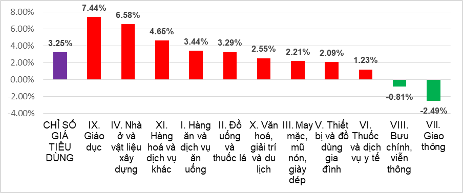 CPI bình quân năm 2023 tăng 3,25% so với năm 2022. Trong đó, chỉ số giá nhóm giáo dục tăng 7,44%; chỉ số giá nhóm nhà ở và vật liệu xây dựng tăng 6,58%, do giá xi măng, cát tăng theo giá nguyên nhiên vật liệu đầu vào, cùng với đó giá thuê nhà ở tăng cao; chỉ số giá nhóm lương thực tăng 6,85%…