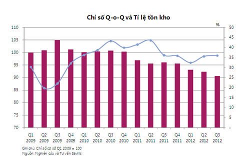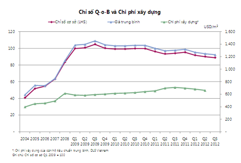 Cụ thể, chỉ số QoQ của quý 3/2012 đứng ở mức 90,6 điểm, giảm nhẹ -1,7 điểm so với quý trước. Nhà ở mất giá 14% kể từ khi đạt đỉnh 105 điểm trong quý 3/2009. Giá trung bình trên thị trường (đã bao gồm các dự án mới) có tốc độ giảm nhanh hơn, xuống khoảng 23%. Điều này cho thấy việc giảm giá chủ yếu đến từ các dự án mới gia nhập thị trường hơn là do các dự án cũ.