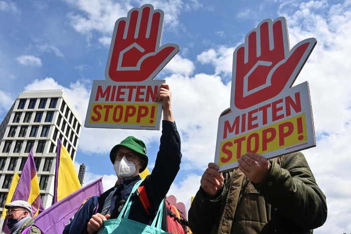 Những người biểu tình cầm cáctấm biển ghi dòng chữ "Rents Stop" tại một cuộc biểu tình ở Berlin