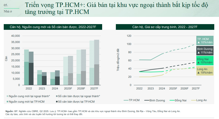 CBRE dự báo, từ nay đến năm 2027, giá căn hộ tại TP.HCM sẽ tiếp tục tăng trung bình 10%/năm, trong khi Long An cũ có thể tăng tới 19%/năm. Sự dịch chuyển này cho thấy bức tranh thị trường bất động sản không chỉ dừng lại ở phạm vi TP.HCM, mà đang mở rộng thành một vùng đại đô thị, nơi hạ tầng và quỹ đất sẽ định hình vị thế, còn chất lượng sản phẩm sẽ quyết định giá trị mới cho toàn thị trường.
