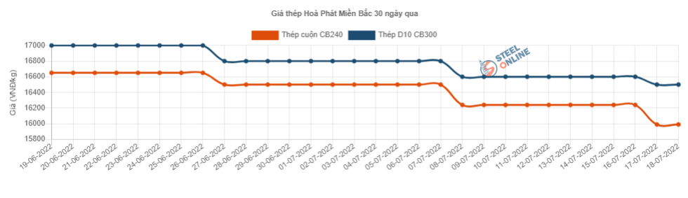 Cụ thể, thương hiệu thép Hòa Phát tại miền Bắc điều chỉnh giảm lần lượt 250.000 đồng/tấn và 100.000 đồng/tấn đối với thép cuộn CB240 và thép thanh vằn D10 CB300. Giá bán sau điều chỉnh của hai loại thép này là 15,99 triệu đồng/tấn và 16,5 triệu đồng/tấn.