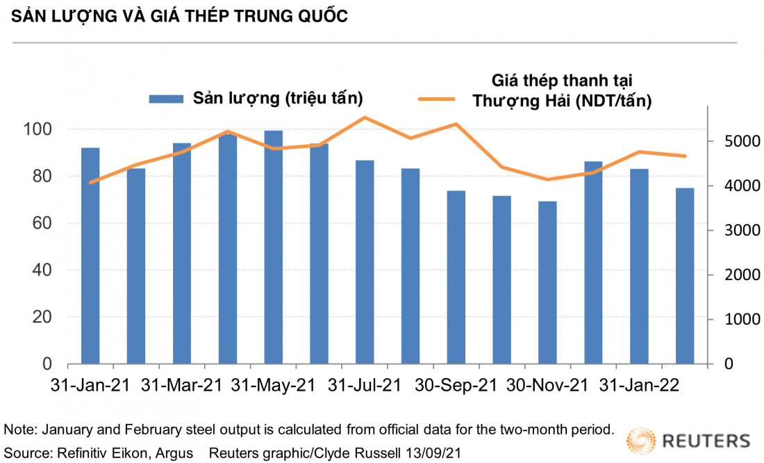Việc hạn chế sản xuất để giảm ô nhiễm trước Thế vận hội mùa đông Bắc Kinh là một phần nguyên nhân khiến sản lượng thép của Trung Quốc giảm. Mặc khác, giá quặng sắt và than cốc tăng cũng sẽ hạn chế nỗ lực của các nhà máy để hoạt động ở công suất cao.
