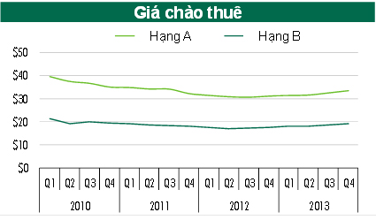 Giá chào thuê văn phòng hạng A và B - Nguồn: CBRE