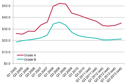 2008 bắt đầu tuột dốc.Vào thời điểm hiện tại, theo báo cáo phân tích về thị trường văn phòng của một số công ty tư vấn bất động sản, thị trường đang ghi nhận mức giá thuê trung bình của văn phòng hạng A khoảng 36 USD/m2. Đây là mức thuê thấp nhất kể từ năm 2008 trở lại đây.