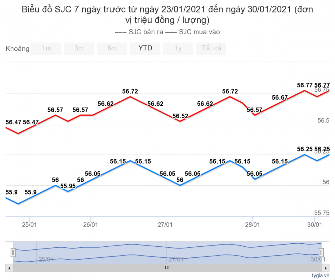 Các phiên sau đó, giá vàng ít biến động. Sang phiên 28/1, giá vàng trong nước giảm mạnh theo giá vàng thế giới. Ngày giá vàng miếng trong nước được Tập Đoàn Vàng bạc đá quý Doji niêm yết cho khu vực Hà Nội ở mức: 56,00 triệu đồng/lượng (mua vào) và 56,50 triệu đồng/lượng (bán ra).