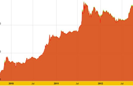 Diễn biến giá vàng SJC trong từ năm 2010 đến tính đến 9h40 hôm nay, 5/10/2012 (đơn vị: nghìn đồng/lượng) - Ảnh: SJC.