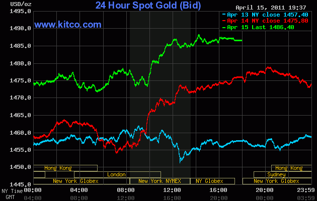 Giá vàng đạt kỷ lục 1.489,10 USD/ounce ở kỳ hạn tháng 6 trong phiên giao dịch cuối tuần, trước khi đóng cửa phiên 15/4 ở 1.486 USD/ounce. Giá vàng giao ngay lập kỷ lục mới ở 1.488,18 USD/ounce. Như vậy trong tuần này, giá vàng đã tăng 0,8%.