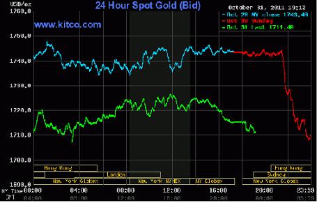 Đà giảm tuy nhiên bị hạn chế bởi nhu cầu mua vào an toàn khi công ty chứng khoán MF Global, được điều hành bởi cựu thống đốc bang New Jersey, người từng là đồng chủ tịch của Ngân hàng Goldman Sachs Jon Corzine, nộp đơn xin phá sản sau khi đón nhận kết quả kinh doanh hàng quý tồi tệ nhất từ trước đến nay do đầu tư vào các khoản nợ tại các quốc gia châu Âu.