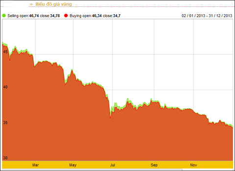 Nếu phiên đầu năm 2013, giá vàng SJC được niêm yết ở giá 46,34-46,74 triệu đồng/lượng (mua – bán), thì đến phiên cuối năm, ngày 31/12/2013 giảm về còn 34,70-34,78 triệu đồng/lượng. Như vậy, sau 1 năm, giá vàng SJC giảm 11,64 triệu đồng/lượng chiều mua vào, và bán ra giảm 11,96 triệu đồng/lượng.