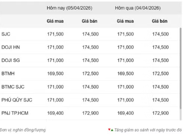 Cụ thể, tại thời điểm 14 giờ ngày 5/4, Công ty Vàng bạc đá quý Sài Gòn (SJC) niêm yết giá vàng miếng SJC mua vào-bán ra ở mức 171,5-174,5 triệu đồng/lượng, tăng 1,7 triệu đồng so cuối tuần trước. Chênh lệch mua-bán 3 triệu đồng/lượng.