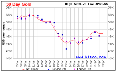 Biểu đồ giá vàng thế giới 30 ngày qua. (Ảnh: kitco.com) |