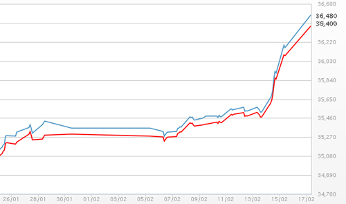 Mở cửa phiên giao dịch đầu tuần, sáng nay (17/2) Công ty vàng bạc đá quý Sài Gòn niêm yết giá vàng SJC ở mức 36,43 triệu đồng/lượng chiều mua và 36,53 triệu đồng/lượng chiều bán. So với giá chốt phiên cuối tuần trước giá vàng đã tăng 320 nghìn đồng/lượng chiều mua và 340 nghìn đồng/lượng chiều bán.