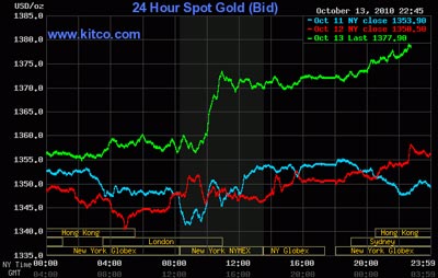 Giá vàng trong nước tăng cao chủ yếu là do giá vàng thế giới tăng mạnh. Giá thế giới đã tăng một mạch 25 USD/ounce trong phiên giao dịch trên sàn New Yorrk hôm qua, lên mức kỷ lục mới 1.375 USD/ounce. Hợp đồng giao tháng 12 nhảy vọt từ 1.355 USD/ounce lên 1.375,70 USD/ounce, trước khi đóng cửa ở 1.370,50 USD/ounce. Giá giao ngay cũng tăng lên mức cao mới 1.374,15 USD/ounce, tăng tới 24 USD/ounce so với giá mở cửa. Đây là lần lập kỷ lục thứ 15 của giá vàng trong gần một tháng rưỡi qua.