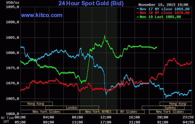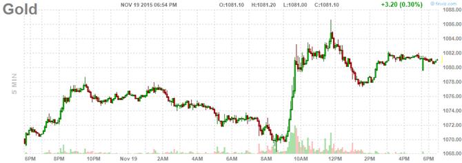 Giá vàng giao tháng 12 tăng 9,2USD, tương đương 0,9% lên chốt tại 1.077,9USD/oz trên sàn Comex tại Sở giao dịch chứng khoán New York Mercantile. Đây là mức tăng trong phiên lớn nhất kể từ ngày 28/10.
