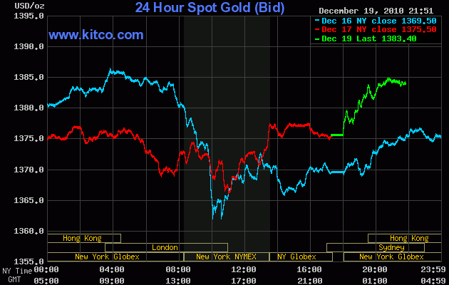 Kết thúc phiên giao dịch ngày 19/12 tại thị trường New York, giá vàng đạt 1383USD/ ounce, tăng nhẹ so với mức đóng của ngày hôm trước.