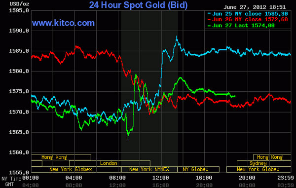 Kết thúc ngày giao dịch, giá vàng giao ngay tăng 0,2% lên 1.574 USD/oz. Còn giá vàng tương lai giao tháng 8 tăng 3,5 USD lên 1.578,4 USD/oz.