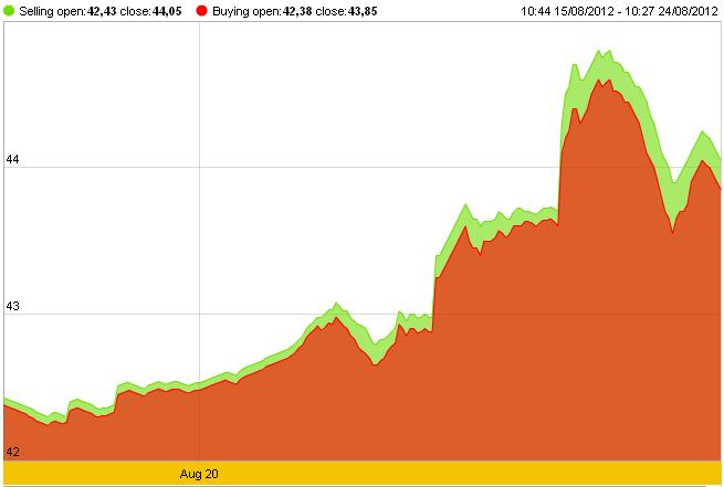 Mở đầu phiên giao dịch sáng nay (24/8), giá vàng SJC của Công ty Vàng Bạc Đá quý Sài Gòn niêm yết mức 43,55 triệu đồng/lượng (mua vào) và 43,9 triệu đồng/lượng (bán ra), giảm từ 1,1 đến 1,9 triệu đồng/lượng so với đỉnh điểm của phiên giao dịch ngày hôm qua. Đến 9h23’, giá vàng SJC bất ngờ tăng lên vượt mốc 44 triệu đồng/lượng nhưng sau đó liền quay đà giảm giá.