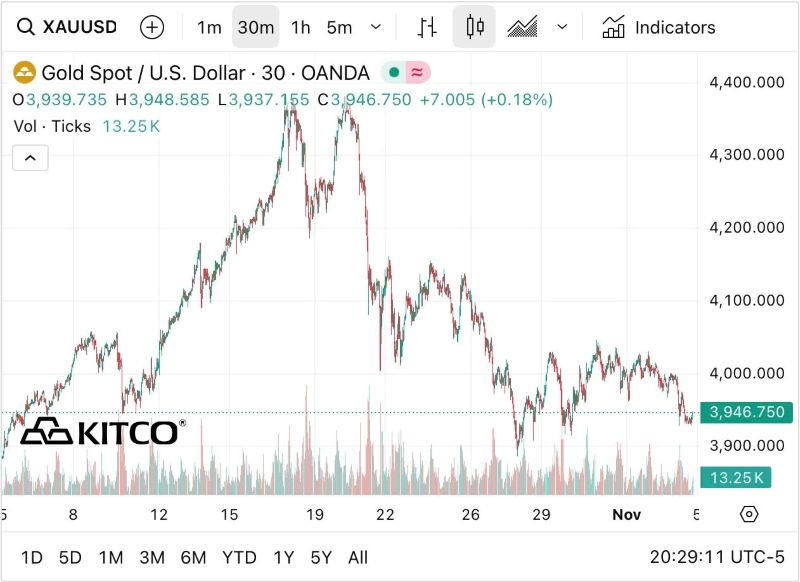 Giá vàng thế giới tiếp tục giảm sâu xuống 3.931,1 USD/ounce trong phiên giao dịch 4/11. Ảnh: Bloomberg.