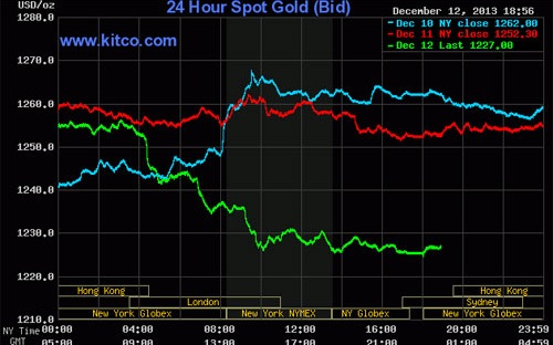 Lúc đóng cửa phiên giao dịch tại New York, giá vàng giao ngay giảm 27,1 USD/oz, tương đương giảm 2,16%, còn 1.226,2 USD/oz. Như vậy, trong hai phiên ngày 11-12/12, giá vàng đã giảm khoảng 37 USD/oz. Hiện vàng đang ở gần mức giá thấp nhất trong 5 tháng thiết lập vào hồi tuần trước.
