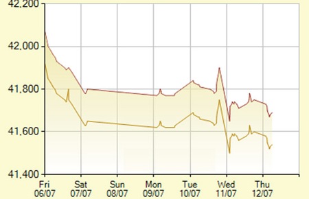 Từ đầu tuần tới thời điểm này, vàng miếng rẻ đi 100.000 đồng/lượng, với giá dao động trong khoảng 41,65-41,9 triệu đồng/lượng. Giá vàng trong nước biến động chậm hơn giá vàng thế giới khiến giao dịch tiếp tục trầm lắng. Ngược lại, theo giới kinh doanh vàng, cũng chính do lực mua bán yếu mà vàng trong nước “không chịu” phản ánh đầy đủ mức độ lên xuống của giá vàng thế giới.